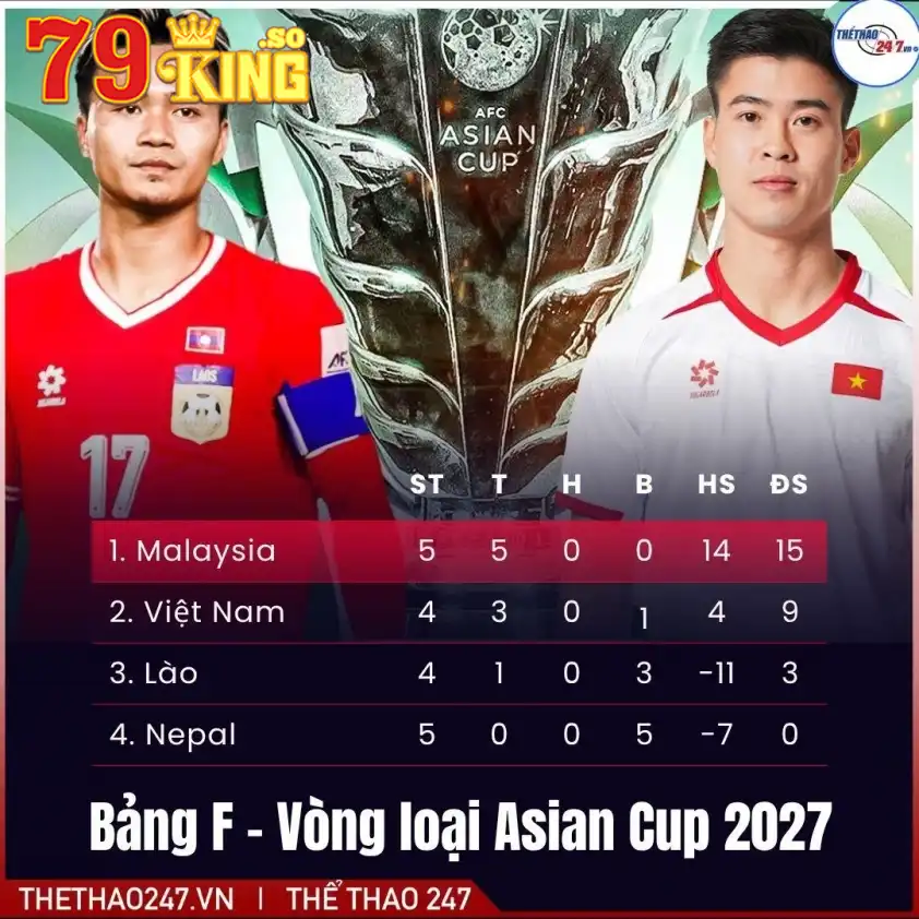 Hiện tại, Việt Nam đang xếp thứ 2 bảng F với 9 điểm, kém Malaysia 3 điểm. Vì chỉ đội nhất bảng mới có vé dự Asian Cup 2027, nên việc giành 3 điểm trước Lào là nhiệm vụ bắt buộc. Nhưng 3 điểm thôi là chưa đủ! Các chiến hữu của TRANG CƯỢC 79KING đều hiểu rằng, **Việt Nam cần ghi càng nhiều bàn thắng càng tốt để cải thiện hiệu số**. Trận đấu này không chỉ là cuộc chiến thắng thua, mà còn là bài kiểm tra bản lĩnh, khả năng tấn công và sự sắc bén của hàng công.